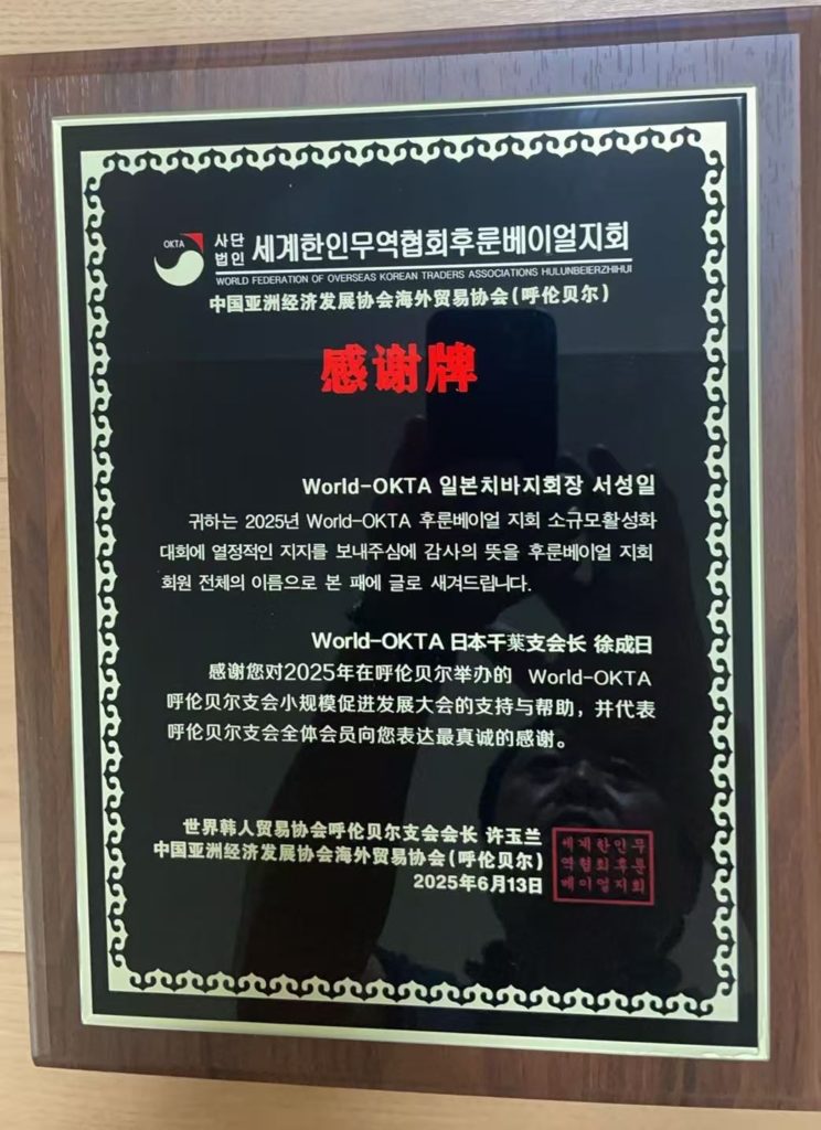 월드옥타 일본 치바지회 서성일 지회장과 조은화 이사는 2025년 6월 13일부터 15일까지, 중국 내몽골 후룬베이얼시에서 열린 『소규모 지회 활성화대회』에 참석했다.